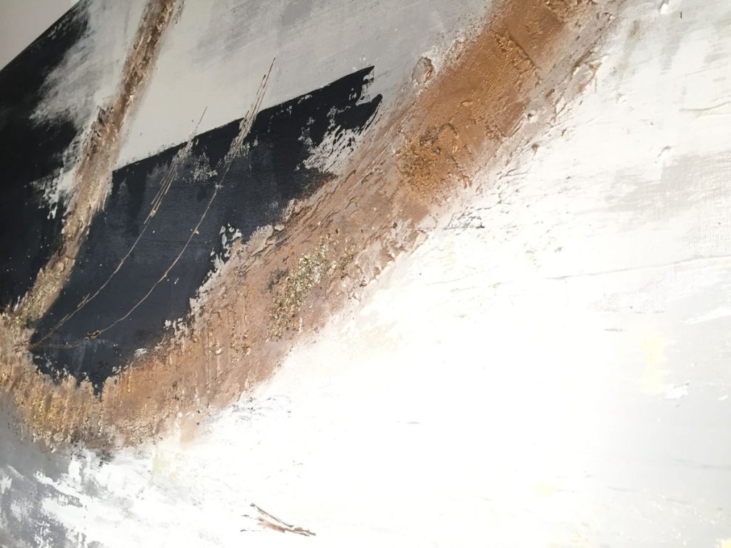 Az ÜSTÖKÖS egy 80×160 cm-es, kézzel készített, sorszámozott absztrakt akrilfestmény fekete, szürke és fehér tónusokkal, arany texturált részletekkel. Elegáns, nagy méretű fókuszpont modern enteriőrökbe.