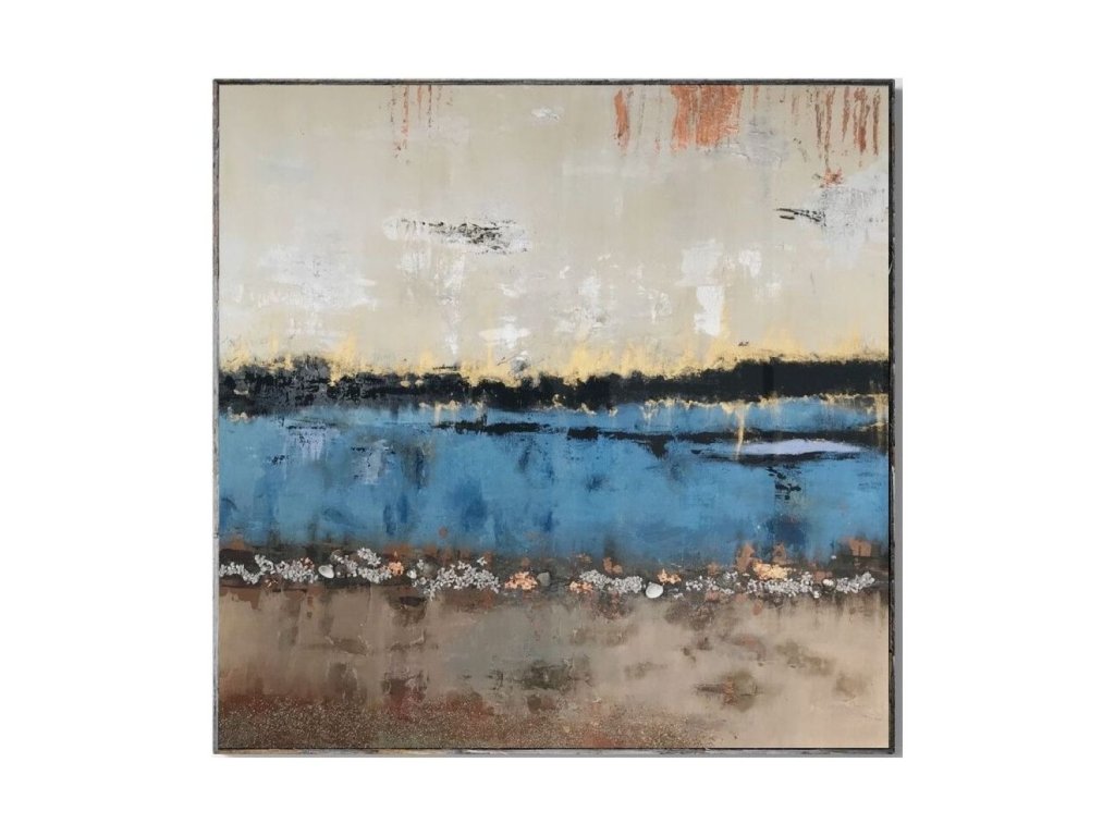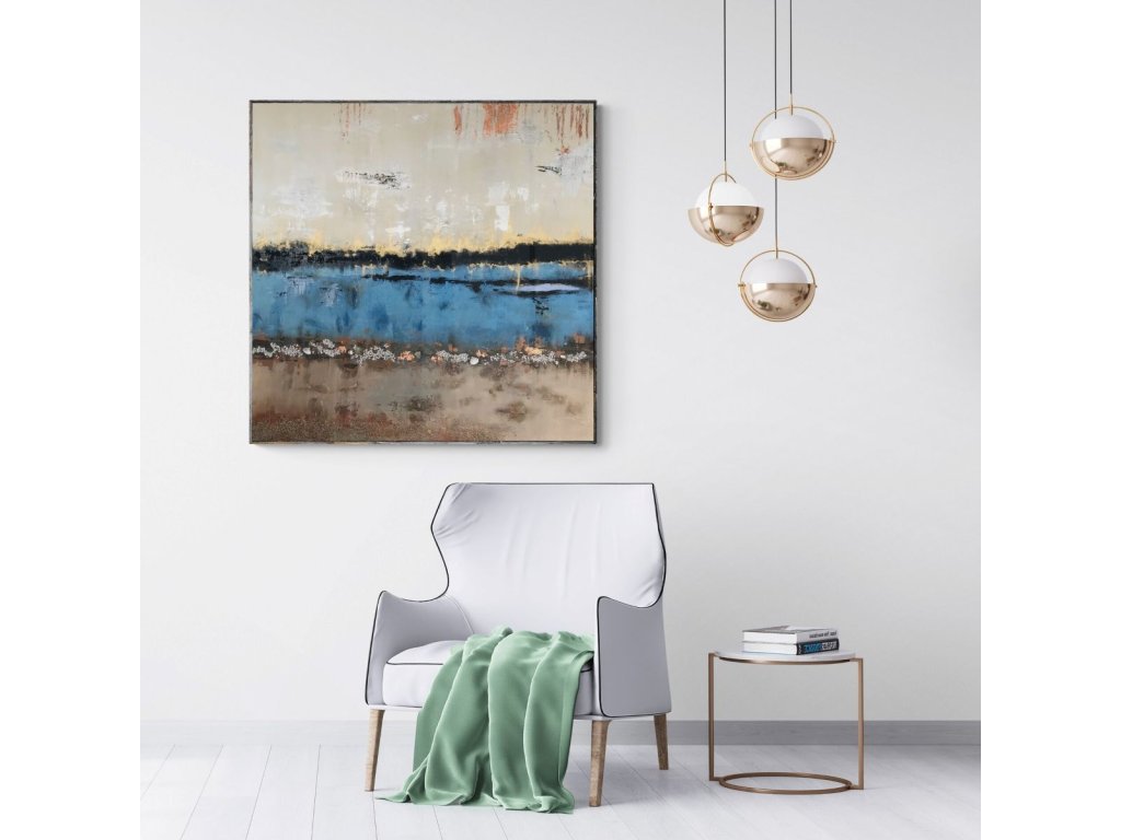 Egyedi, kézzel festett absztrakt festmény 100×100 cm méretben, amely a természet nyugalmát és a folyópart hangulatát idézi. Eredeti alkotás, modern enteriőrökhöz.