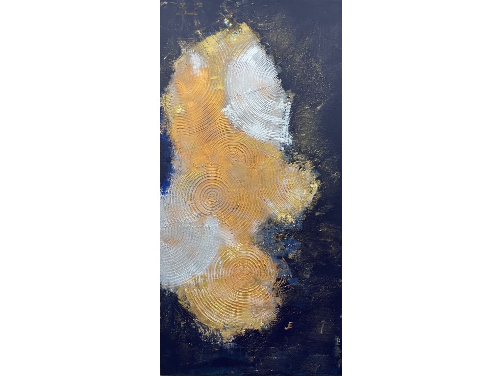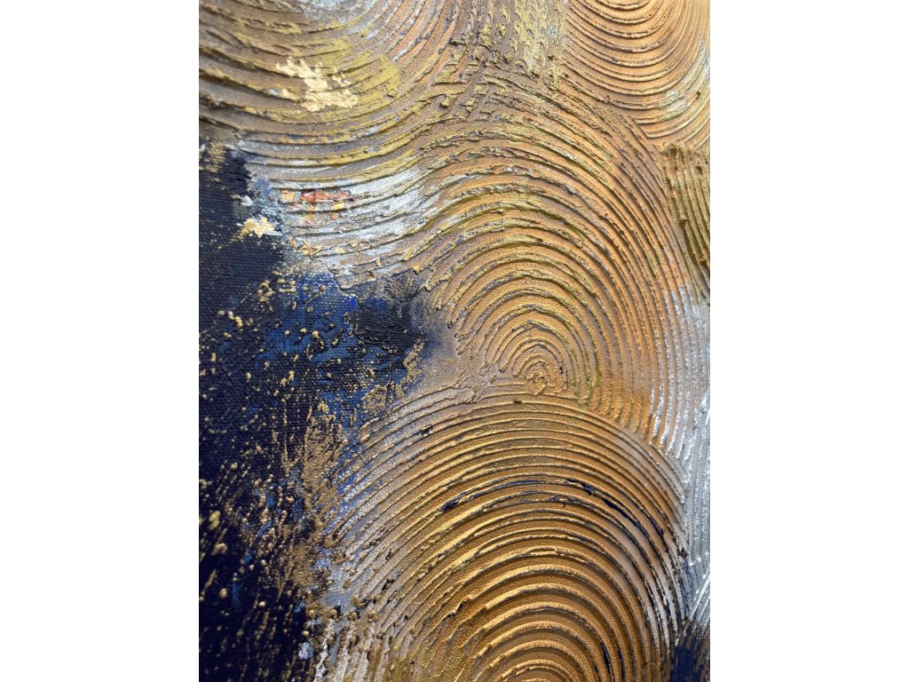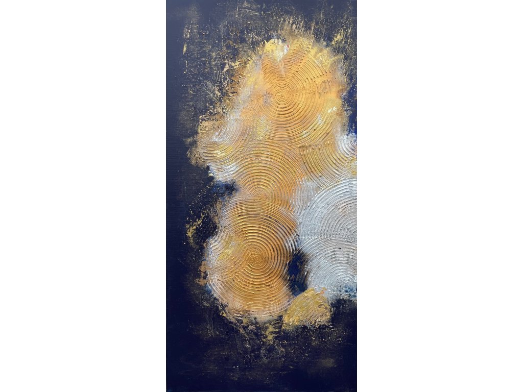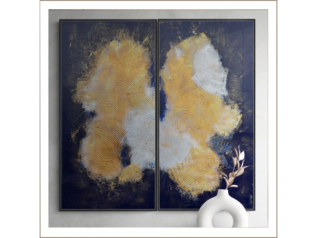 Az Arany tallérok 2 egy két részből álló, visszafogottan elegáns 2X50X100 cm-es festmény, amelyben a tallér alakú arany textúrák ragyogóan emelkednek ki a sötétkék háttérből