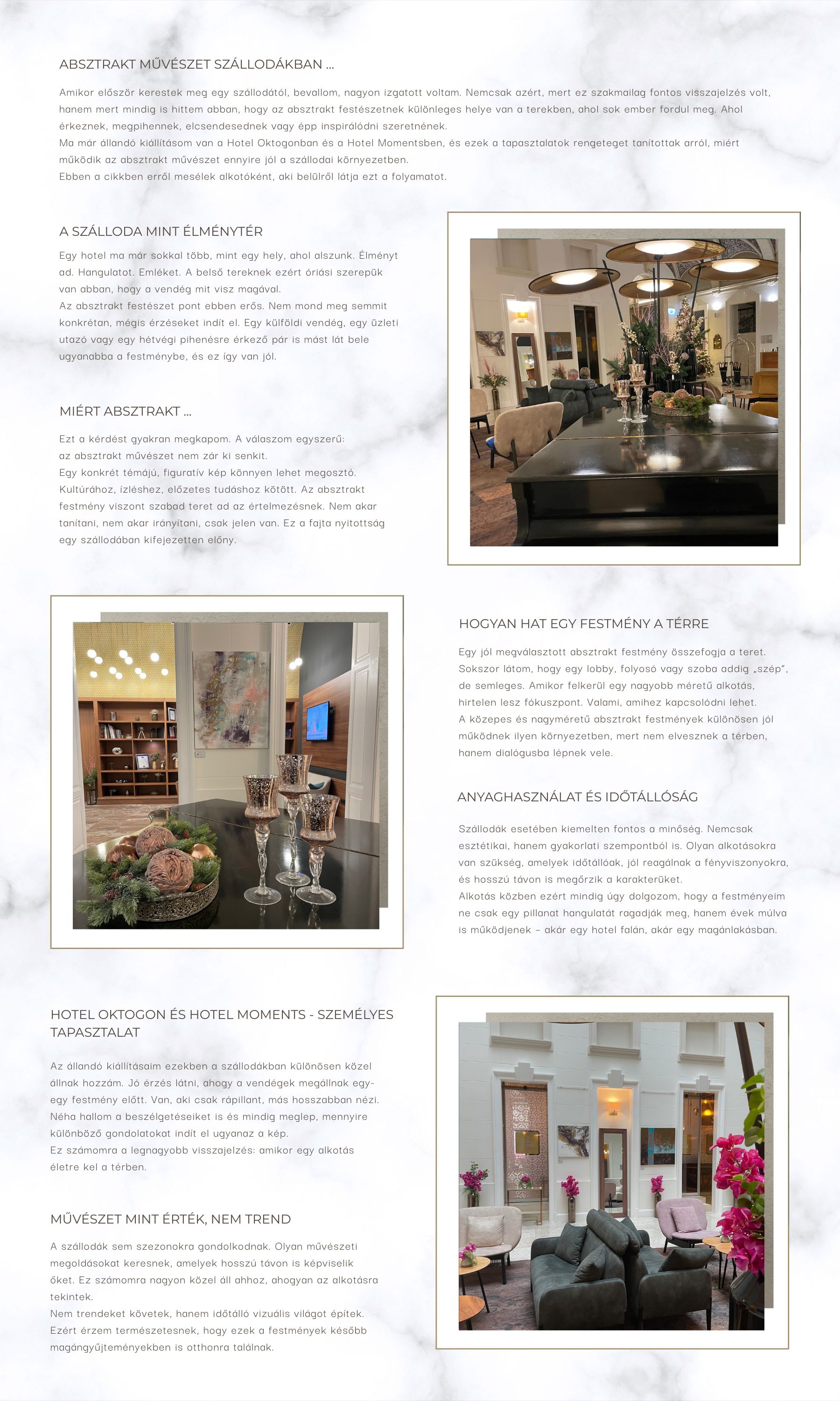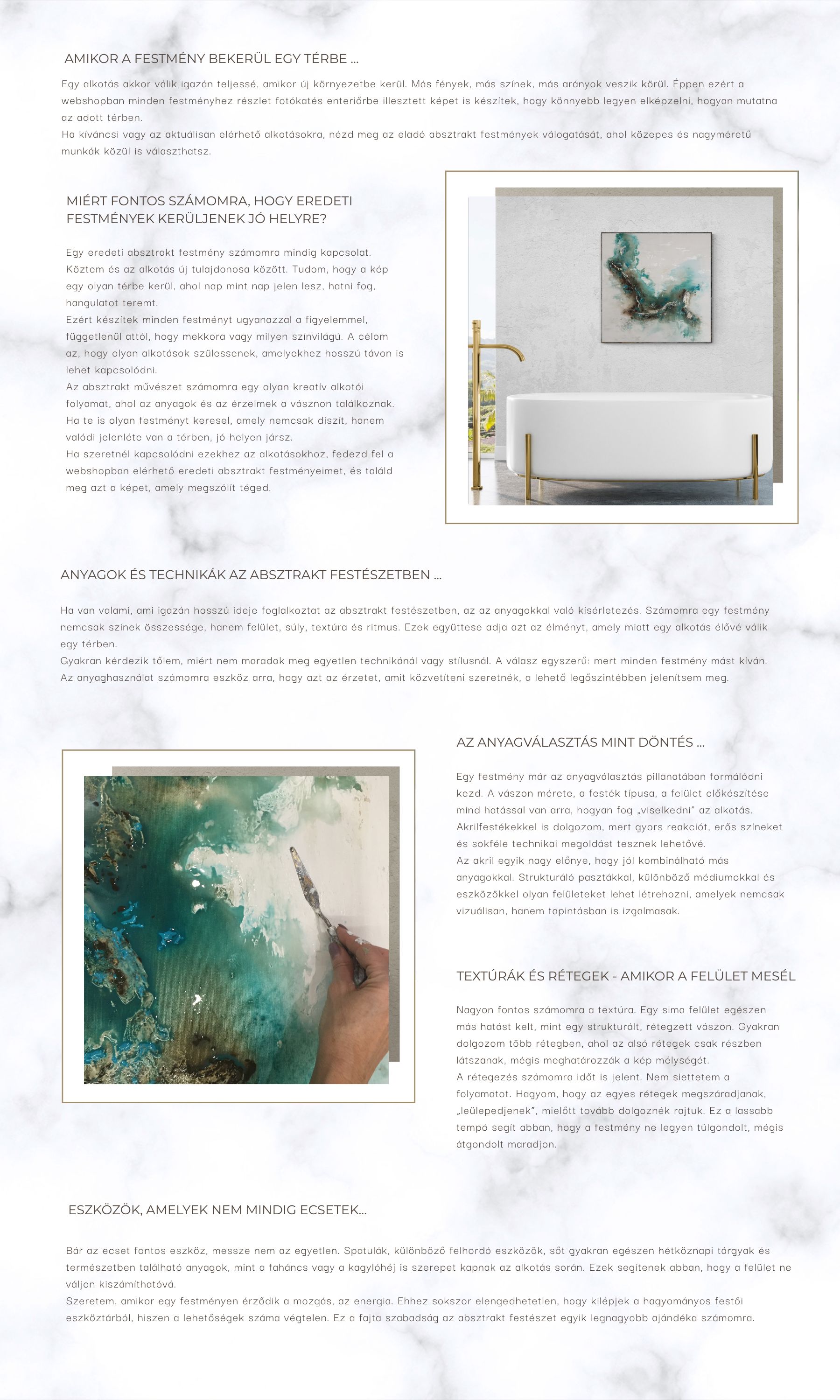 Az absztrakt festmények anyaga és technikája végső soron nem öncélú kísérletezés, hanem annak az alapja, hogy egy alkotás idővel is élő maradjon – vizuálisan, térben és érzetben egyaránt.