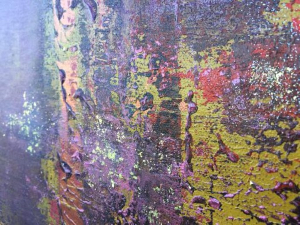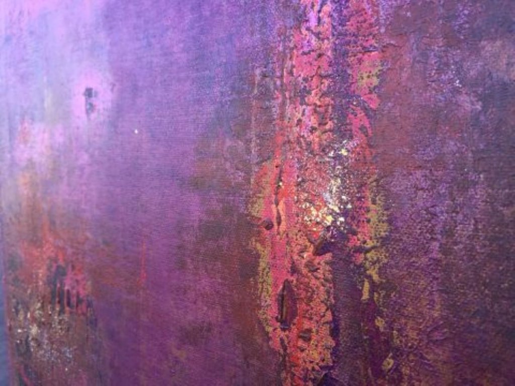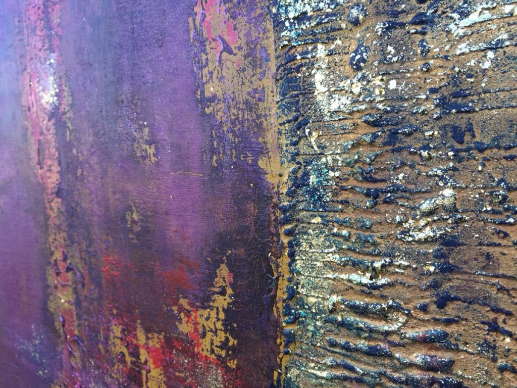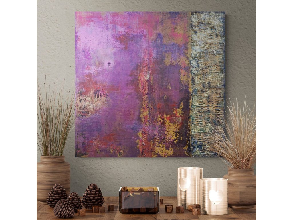 A pink, bronz, lila és arany tónusok meleg, gazdag hangulatot sugároznak, miközben az arany szemcsék finom csillogása emeli ki a festmény fényjátékát. A bronz hatású, durván texturált oldalak valódi 3D megjelenést kölcsönöznek az alkotásnak, amely a fény beesési szögétől függően folyamatosan változó arcát mutatja.