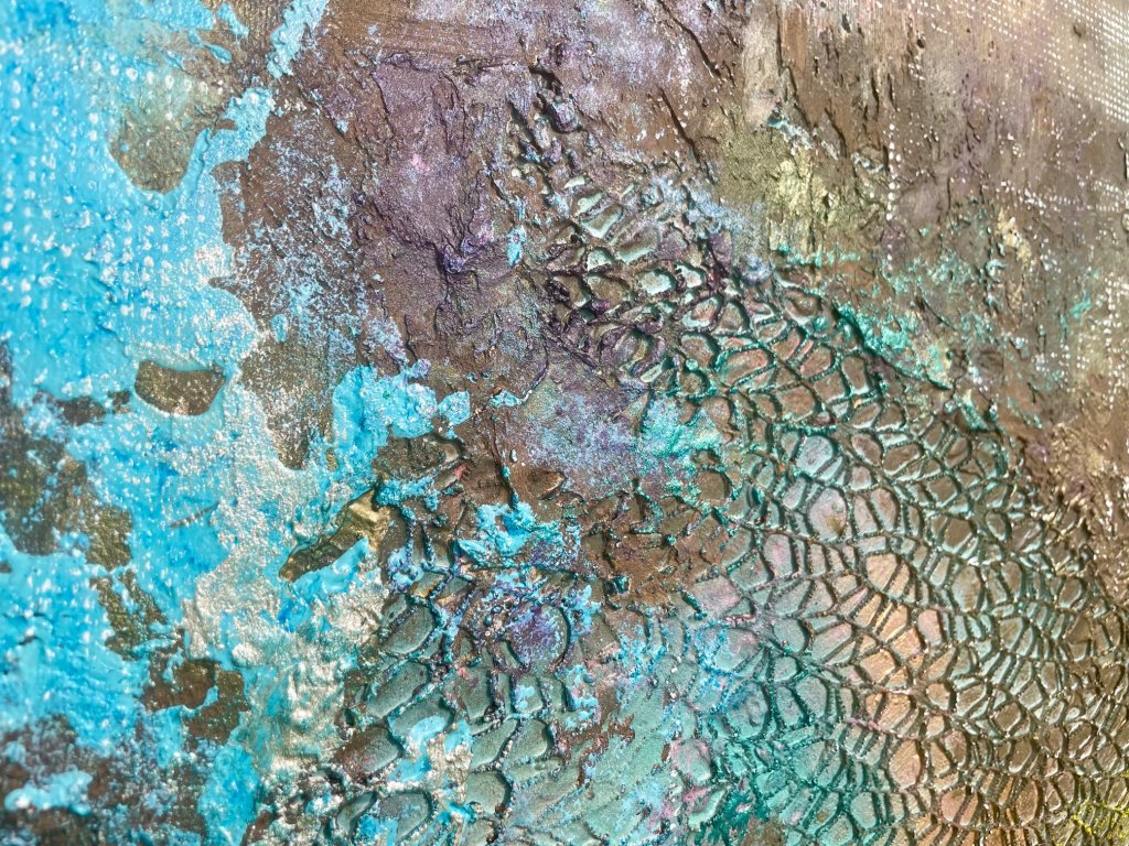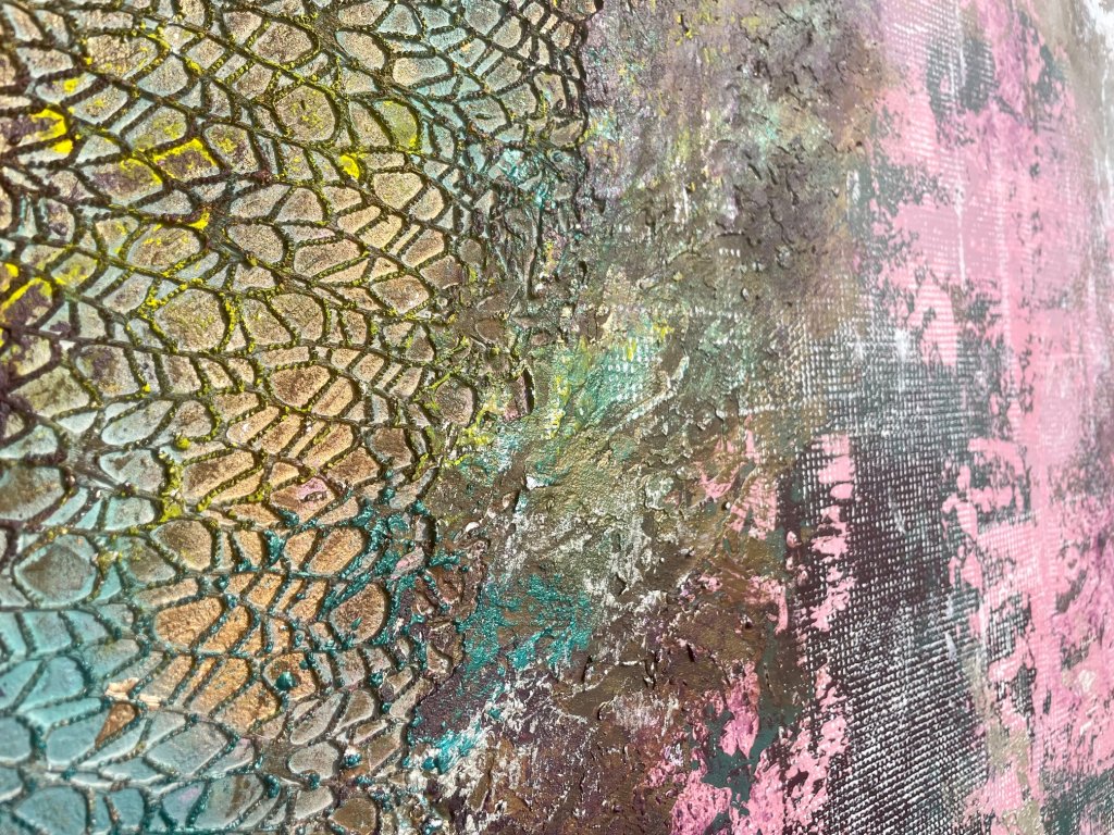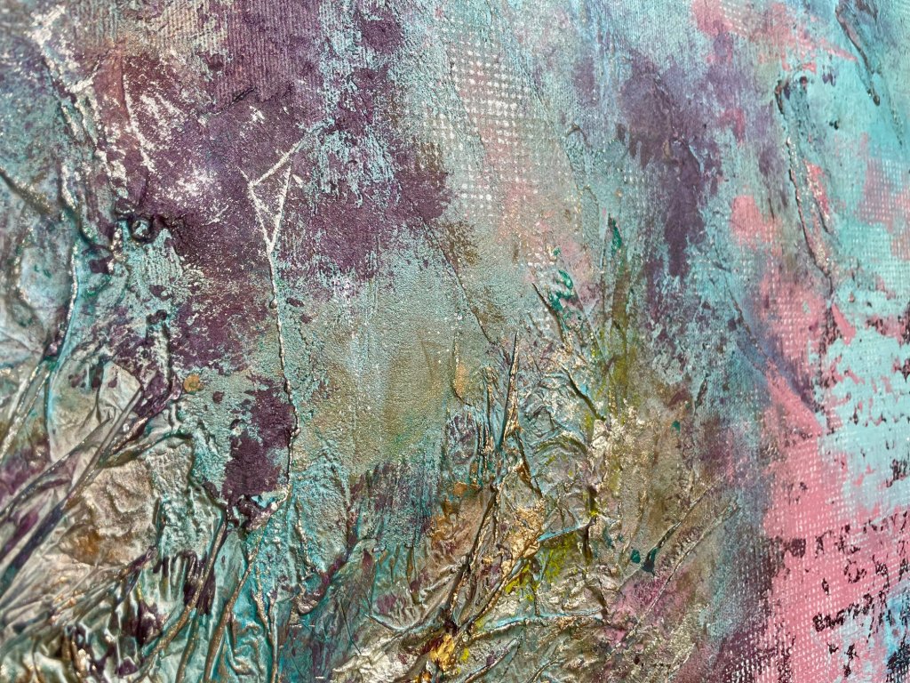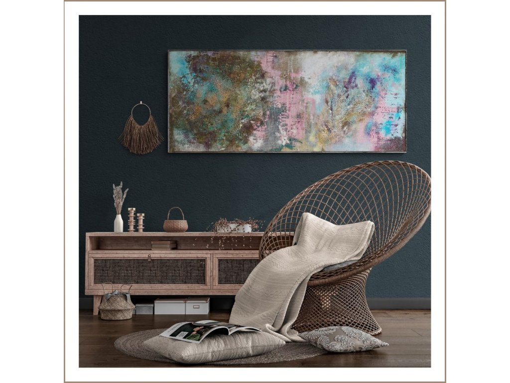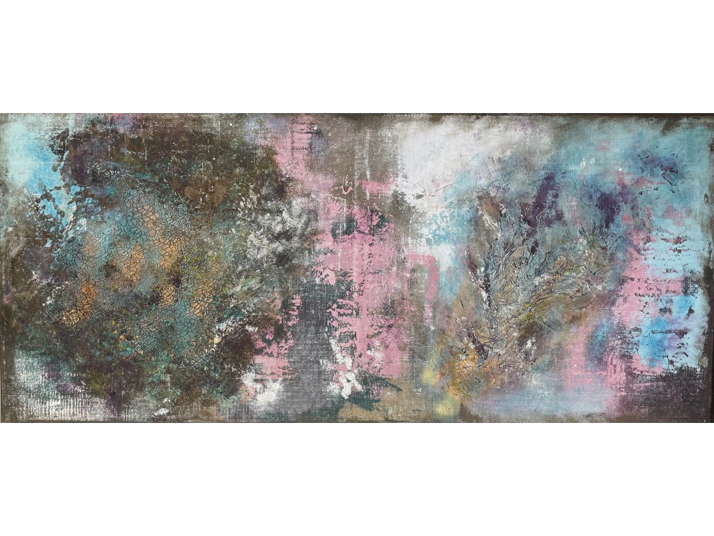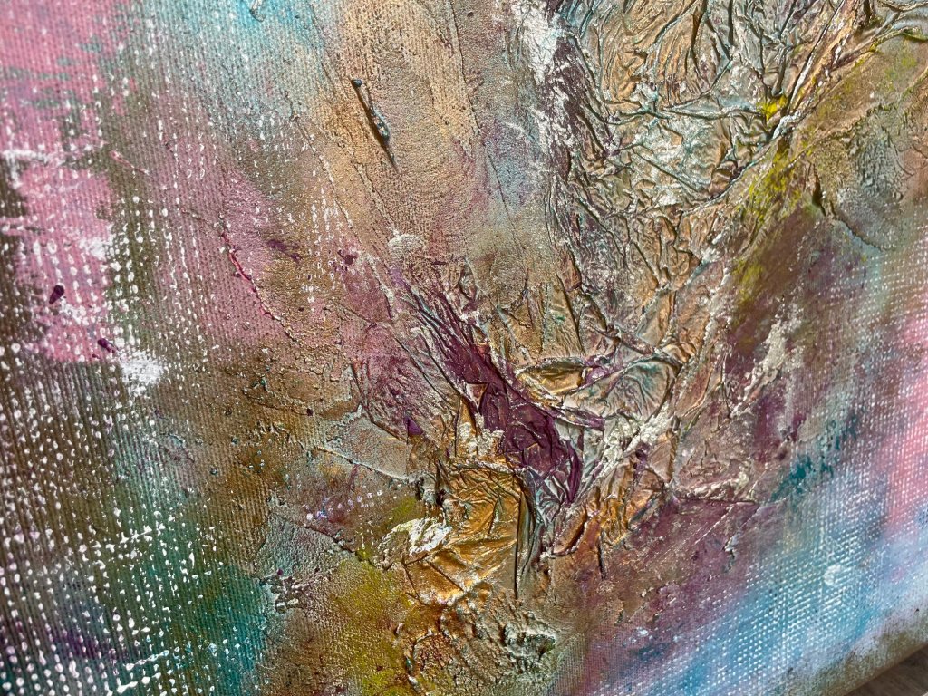 A gazdag művészi struktúra, a tapintható homokos textúra és az arany füstfólia finom ragyogása ködös, lebegő tájat idéz meg. A rétegzett akril ecsetvonások a transzformáció és a nyugalom határán egyensúlyoznak, egy korai reggel hangulatát közvetítve, ahol minden lehetséges. Az alkotás minimalista eszközökkel pink, kék, bronz tónusok egyensúlyával teremt mély érzelmi és inspiráló élményt, ideális választás harmonikus, elmélyülésre hívó enteriőrökbe.