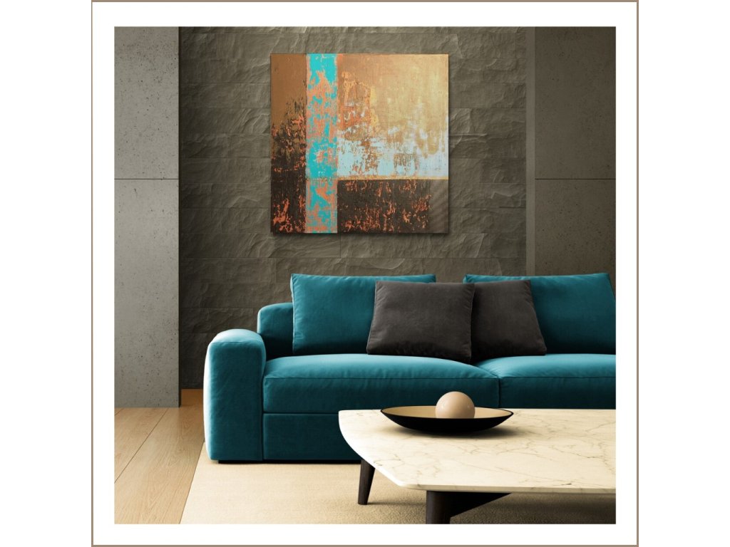 A Flames egy 90×90 cm-es, kézzel készült, térhatású absztrakt akrilfestmény gazdag, rétegzett mixed media felülettel. Modern, energikus hangulatú, egyedi és sorszámozott alkotás, amely vakrámára feszítve azonnal falra akasztható.