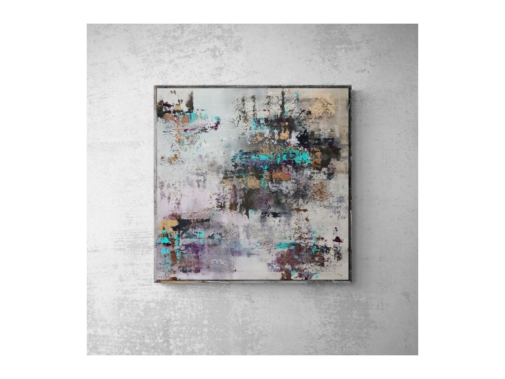 Eredeti, texturált absztrakt akril festmény lila és türkiz árnyalatokkal, fémes pigmentekkel. Egyedi hangulatú, modern faldekoráció. Az alkotás elkelt.