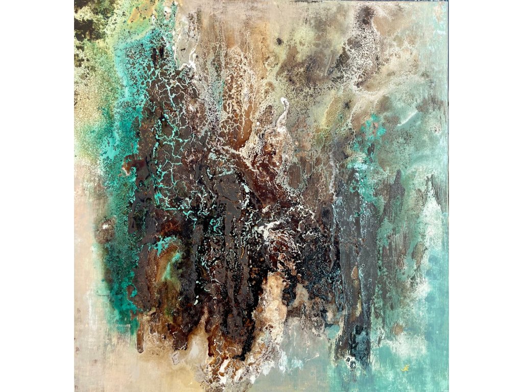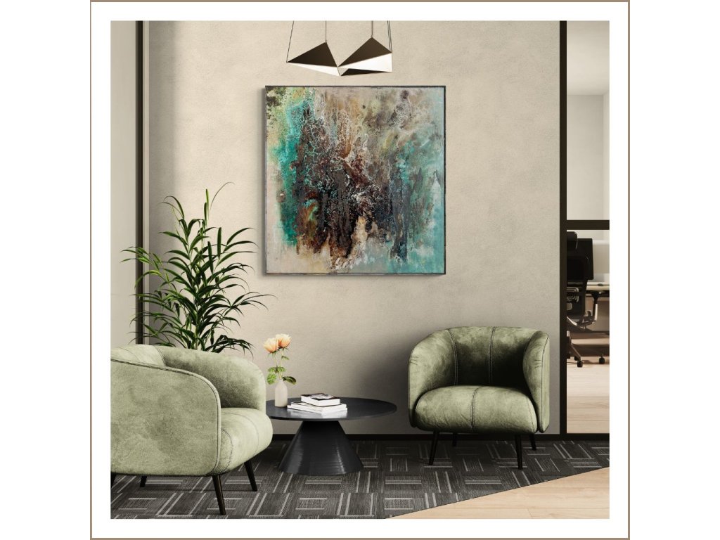 A fehér, bézs, sötétbarna és intenzív zöld árnyalatok, valamint a finom galambszürke tónusok harmonikus, mégis drámai kontrasztot hoznak létre. Ideális kortárs művészeti gyűjtőknek, modern enteriőrök fókuszpontjaként, vagy bárkinek, aki szereti az organikus színáramlásokkal kifejezett érzelmi mélységeket.