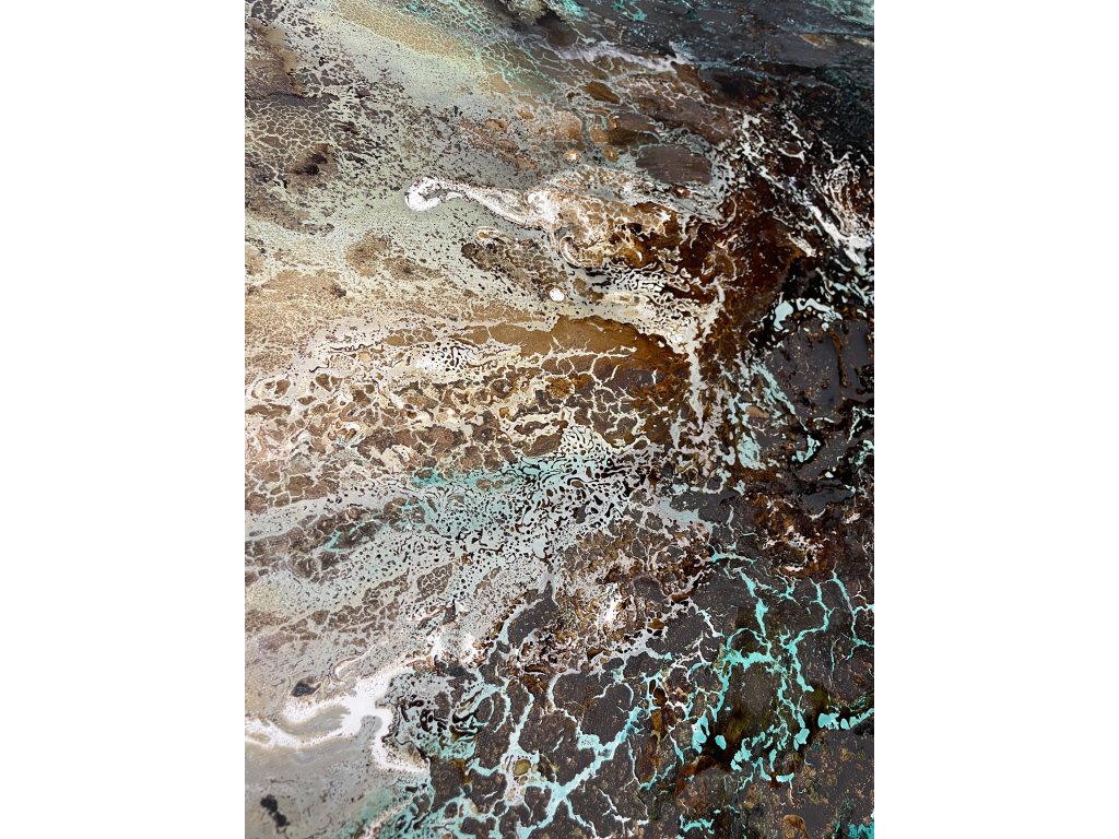 A MÉLYSÉG KAPUJA egy absztrakt, fluid art technikával készült festmény, amely a belső érzelmi világ és az önismeret mélységét jeleníti meg