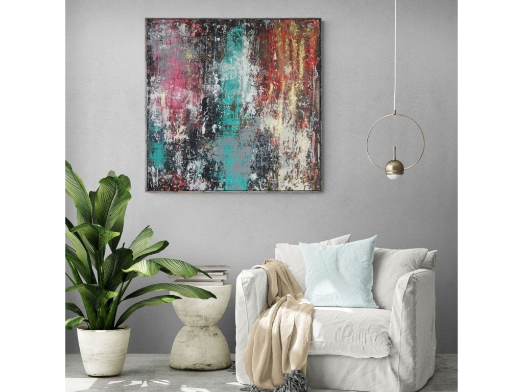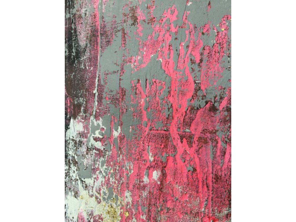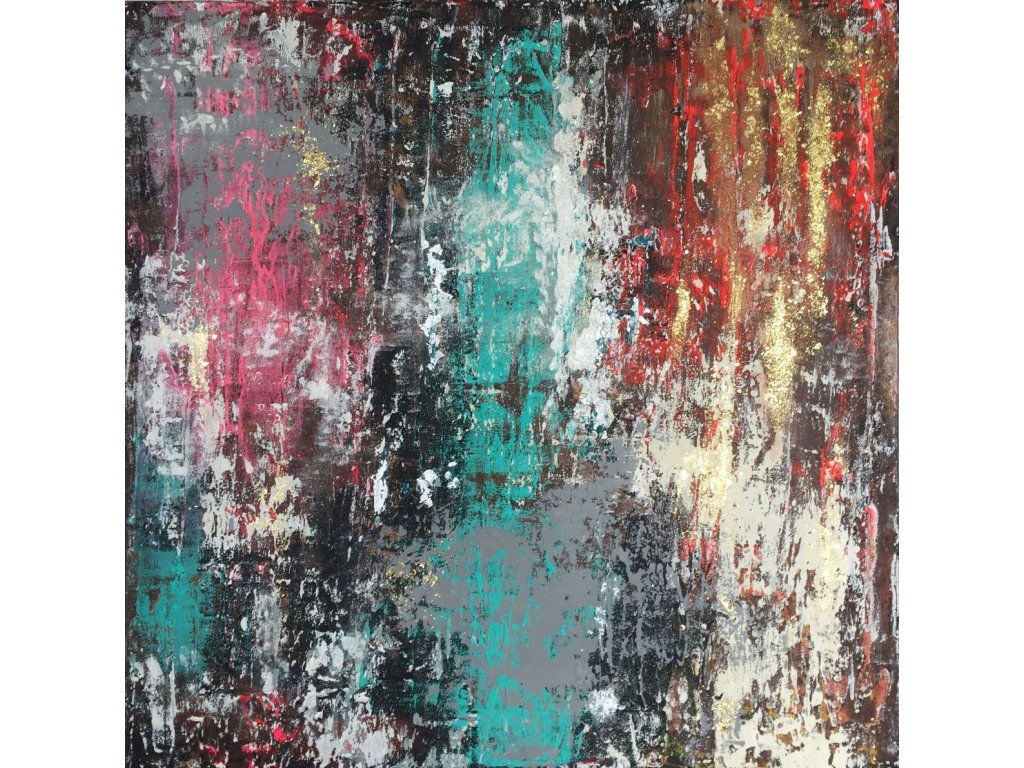 A színvilágban megjelenő piros, arany, zöld, pink és bézs árnyalatok dinamikus, mégis harmonikus összhangot alkotnak. A fémes pigmentek finom fényjátéka a tér különböző pontjairól nézve mindig más arcát mutatja, így a festmény folyamatos vizuális élményt nyújt.