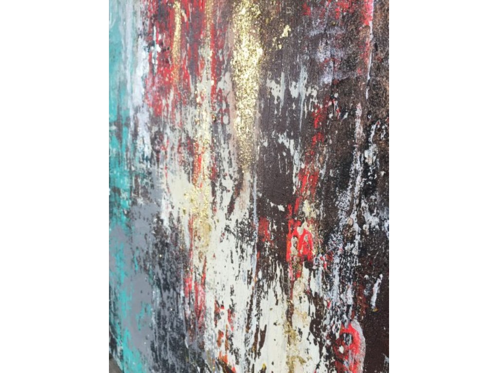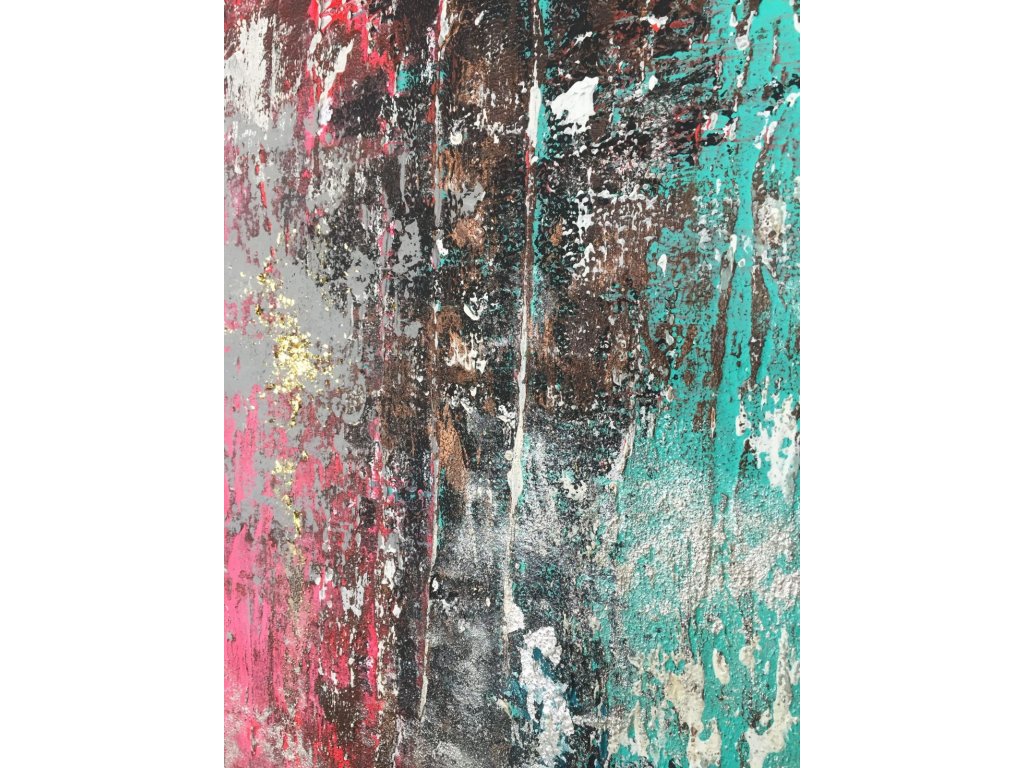 Mixed media technikával, rétegzett festéssel és gazdag, kézzel kialakított 3D textúrával.