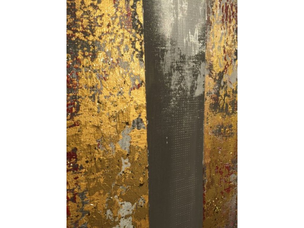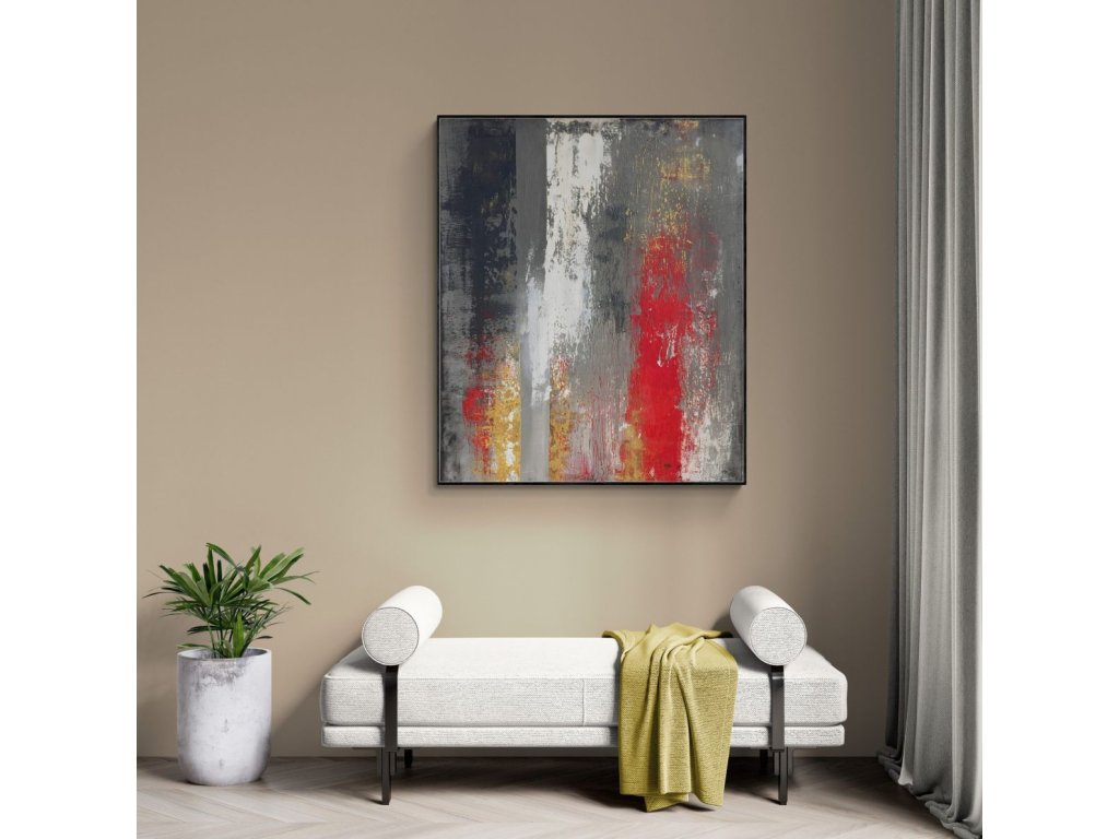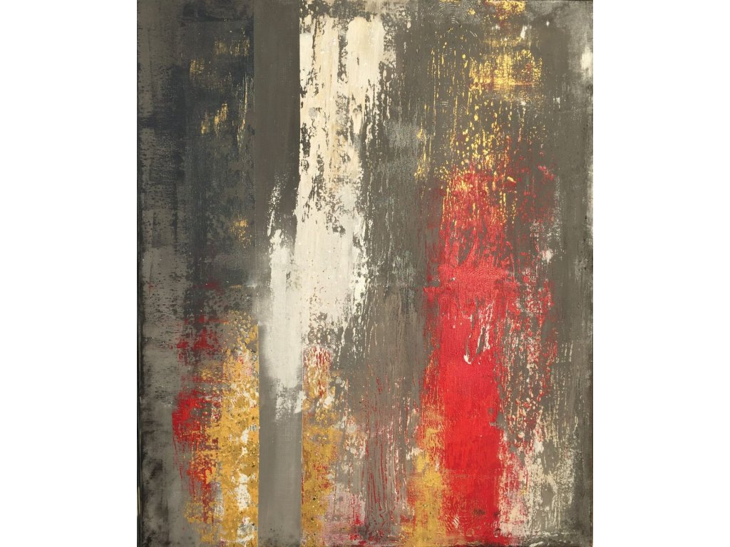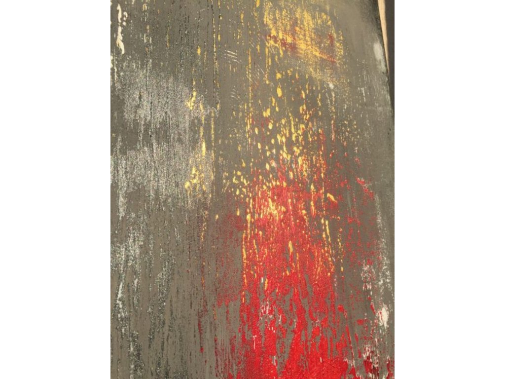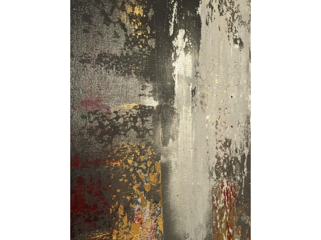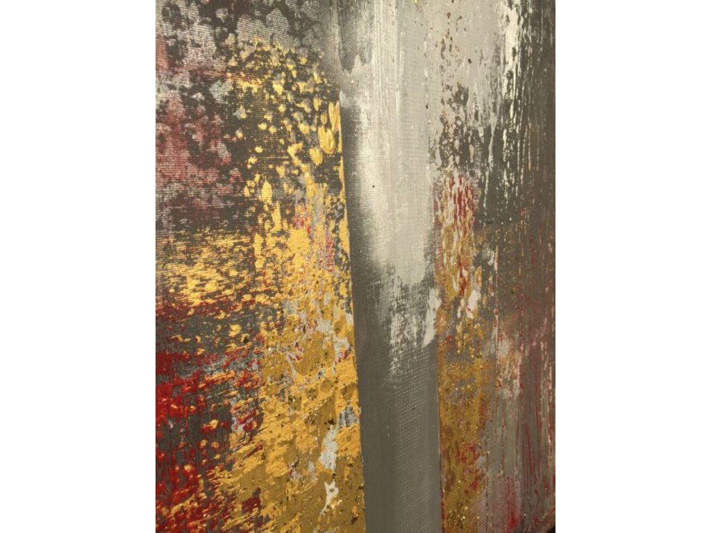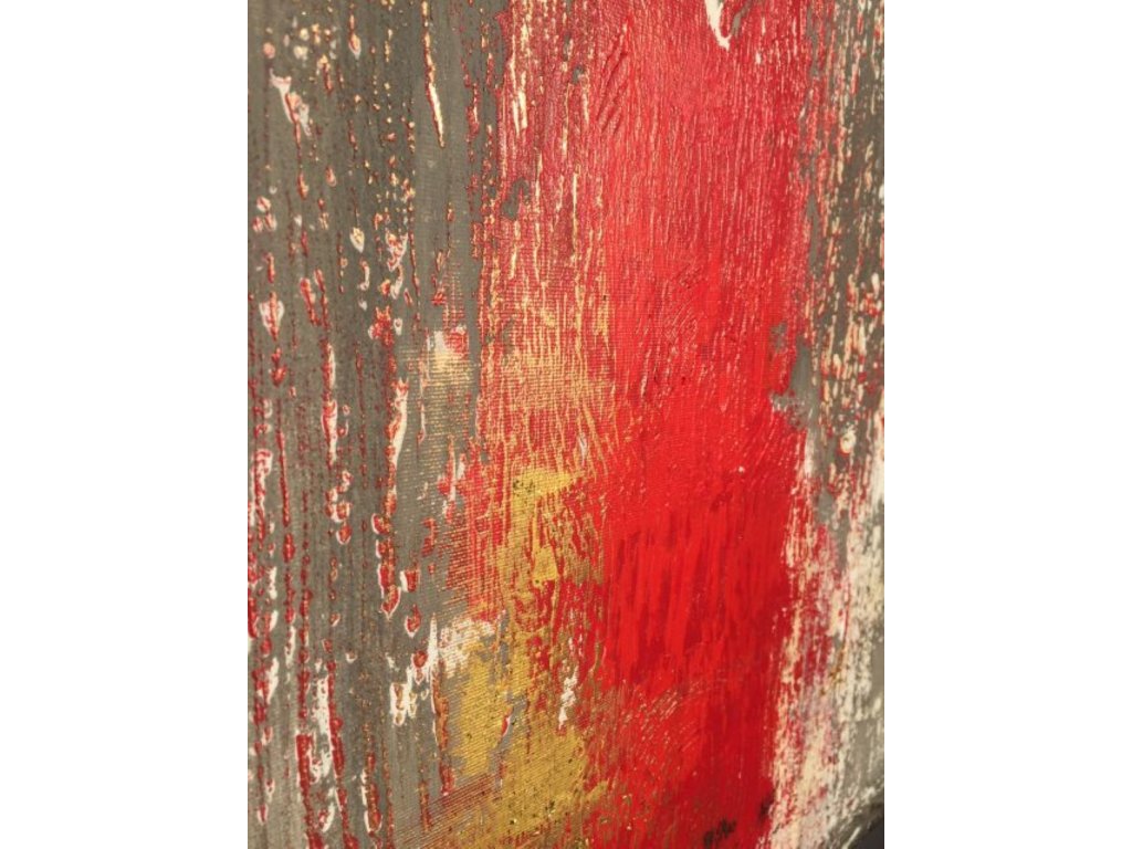 A festmény piros, arany és fehér árnyalatai dinamikus kontrasztot alkotnak. A grafit tónusú háttér mélységet ad, míg a fényes piros és arany felületek intenzív, szinte vibráló hatást keltenek. A rétegek és struktúrák a fény hatására folyamatosan változnak, így a festmény mindig új arcát mutatja.