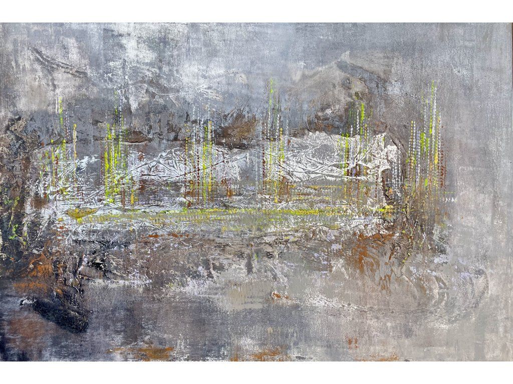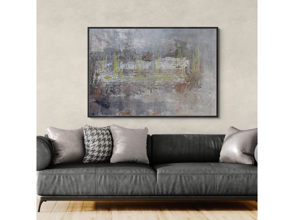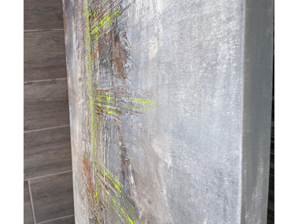 Szürke árnyalatok, fémes tónusok, valamint finom lime és sárga részletek alkotják a kompozíciót, miközben az épületek körvonalai és absztrakt formái urban hangulatot sugároznak. Ideális választás modern, loft vagy minimalista enteriőrökbe, ahol a város lüktetését szeretnénk vizuálisan megjeleníteni. A festmény mérete 120x80 cm.