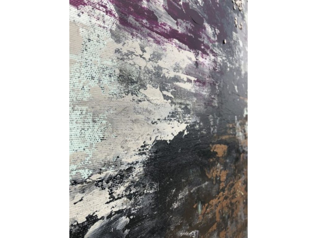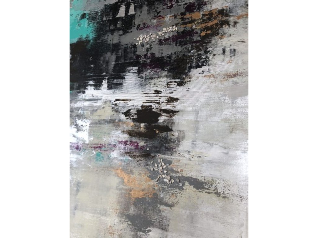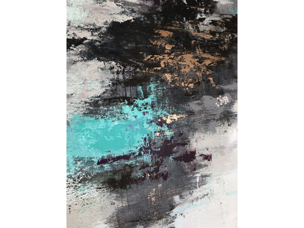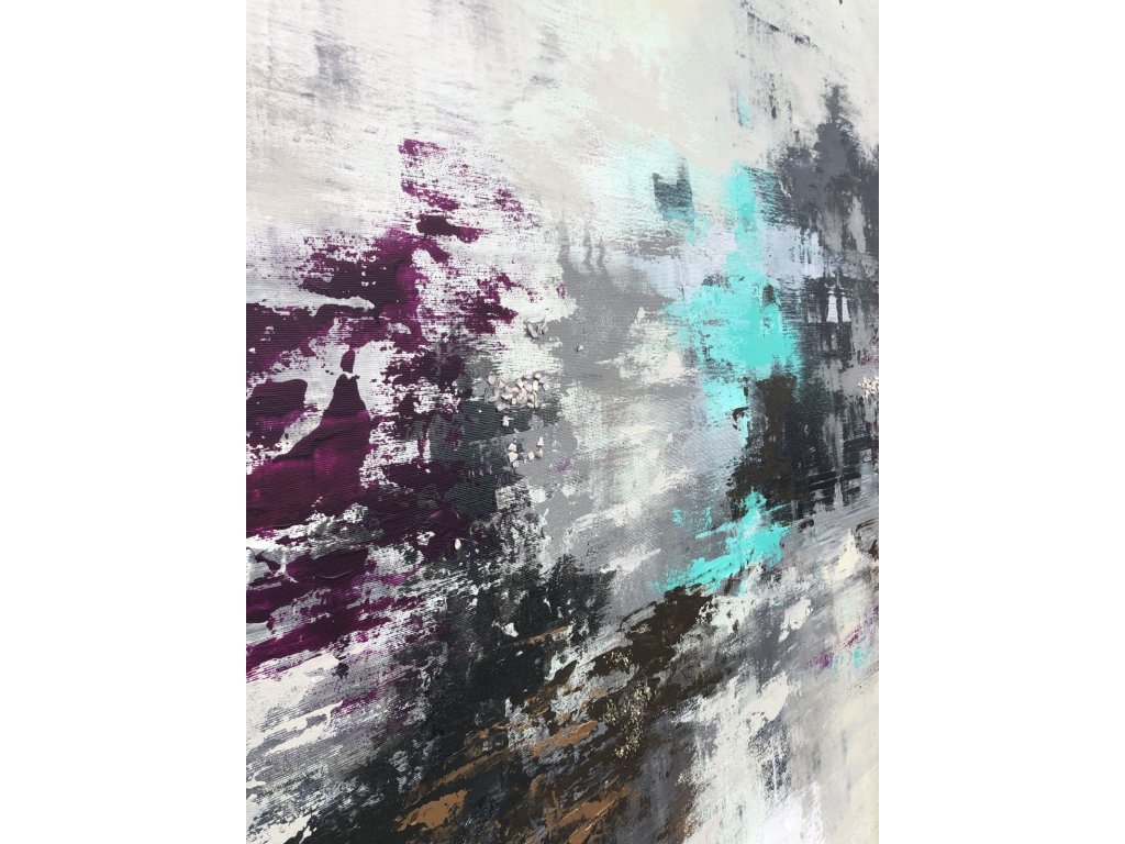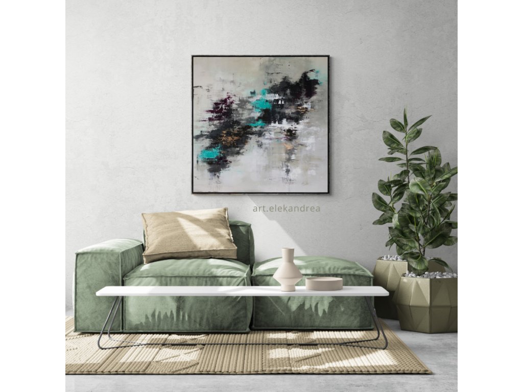 A Rendeződés egy 120×120 cm-es, kézzel festett, sorszámozott absztrakt akrilfestmény. Türkiz, lila és grafit tónusai harmonikus, mégis karakteres vizuális egyensúlyt teremtenek. Keretezés igény szerint kérhető.