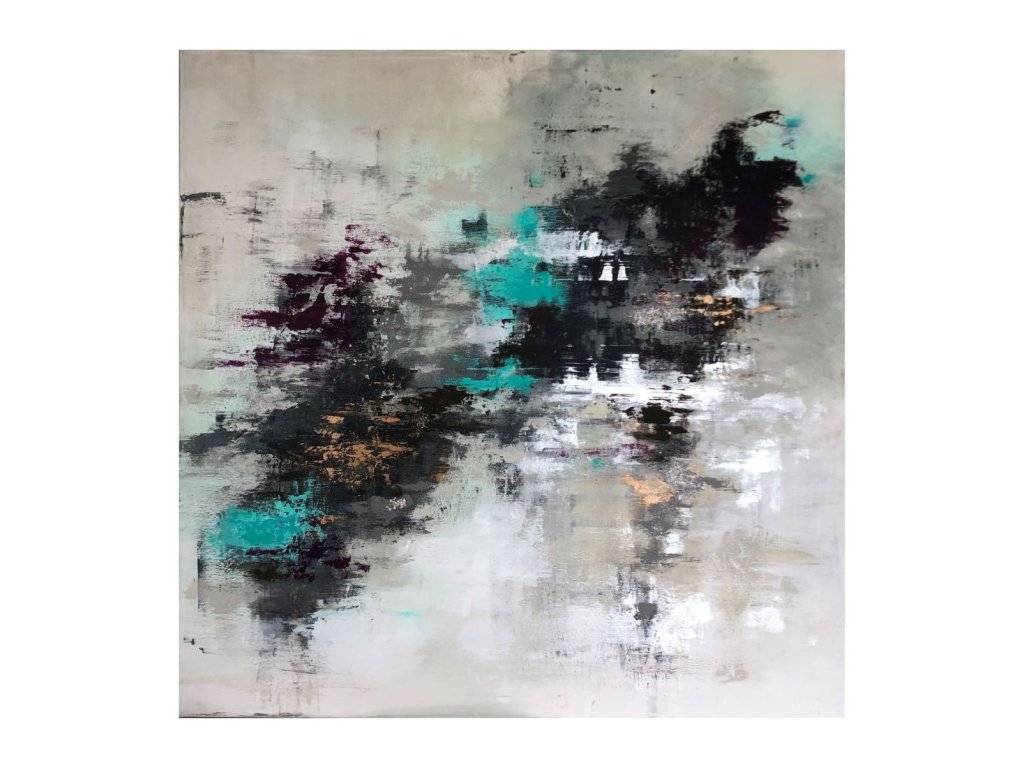 A Rendeződés egy 120×120 cm-es, kézzel festett, sorszámozott absztrakt akrilfestmény. Türkiz, lila és grafit tónusai harmonikus, mégis karakteres vizuális egyensúlyt teremtenek. Keretezés igény szerint kérhető.