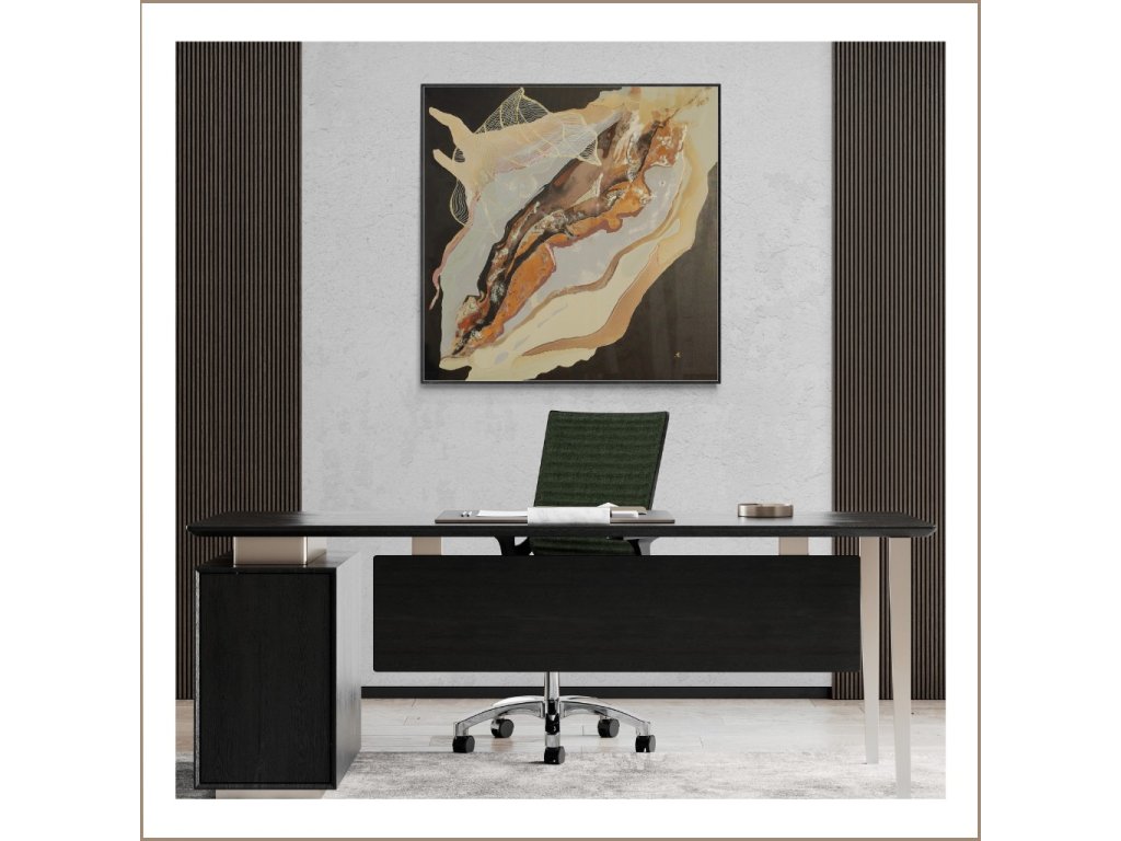 A festmény gazdag, rétegzett struktúrája vastag akril- és textúraanyagok felhasználásával készült. A bézs, barna, fekete és arany árnyalatok dinamikus játéka mélységet és mozgást kölcsönöz a felületnek, miközben a fémes részletek finoman reflektálják a fényt.