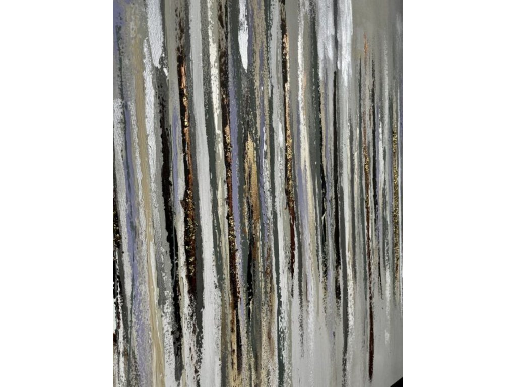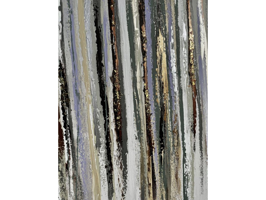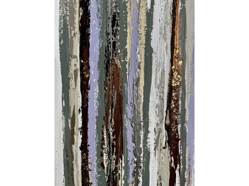 A festmény vegyes technikával készült, ahol a csillogó, fémes és földszínű árnyalatok harmonikusan kapcsolódnak egymáshoz. A bronzos, aranyos és neutrális tónusok különleges mélységet és finom luxusérzetet teremtenek, miközben a felület struktúrája élővé és dinamikussá teszi az alkotást.