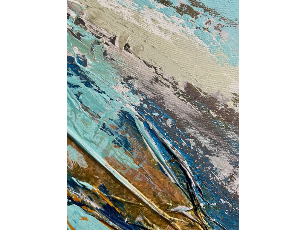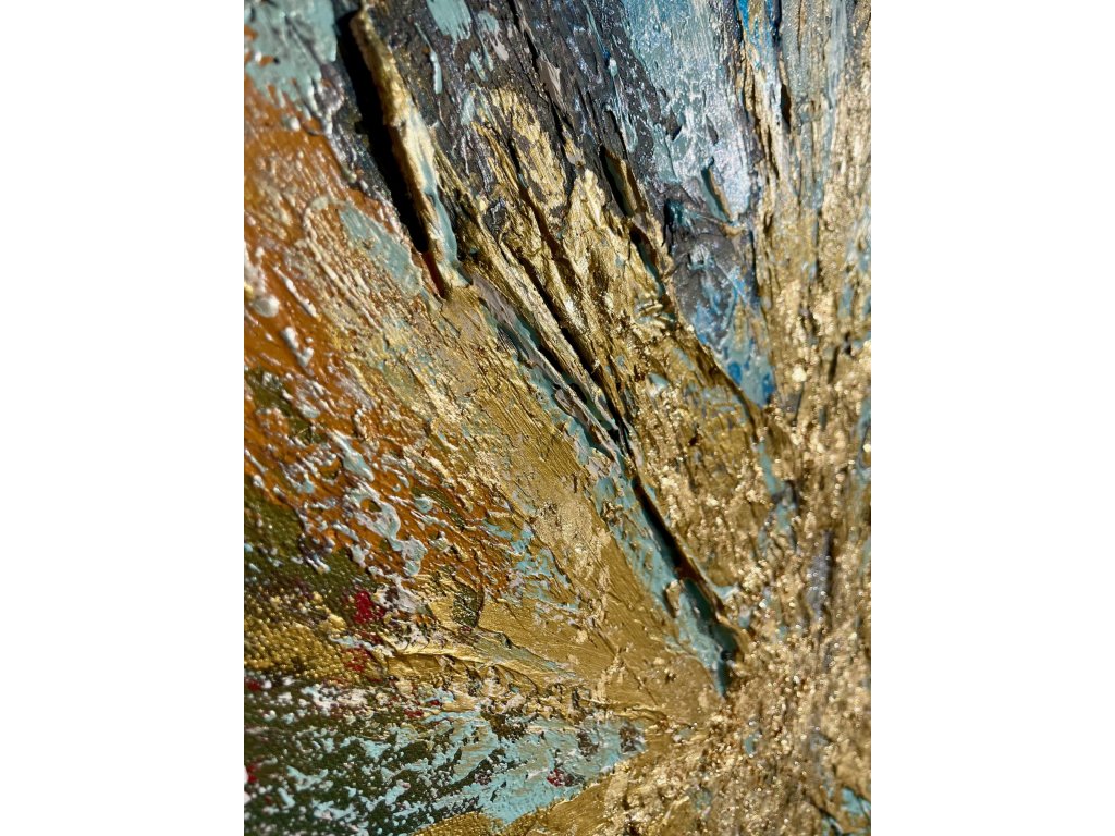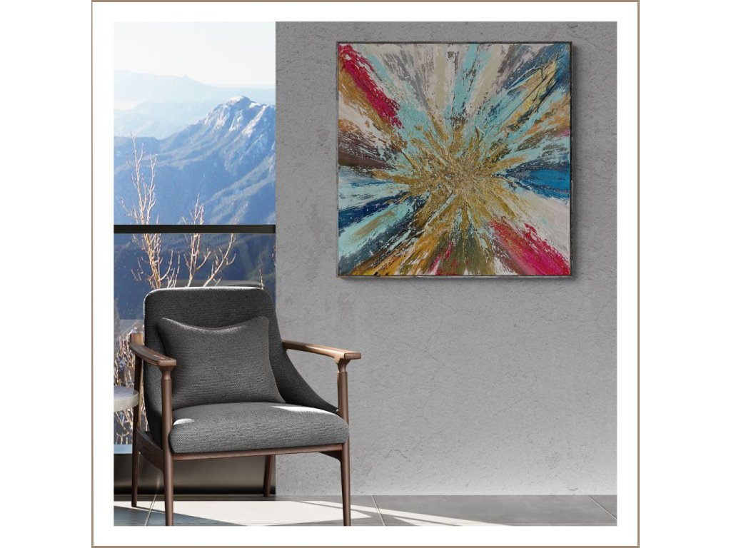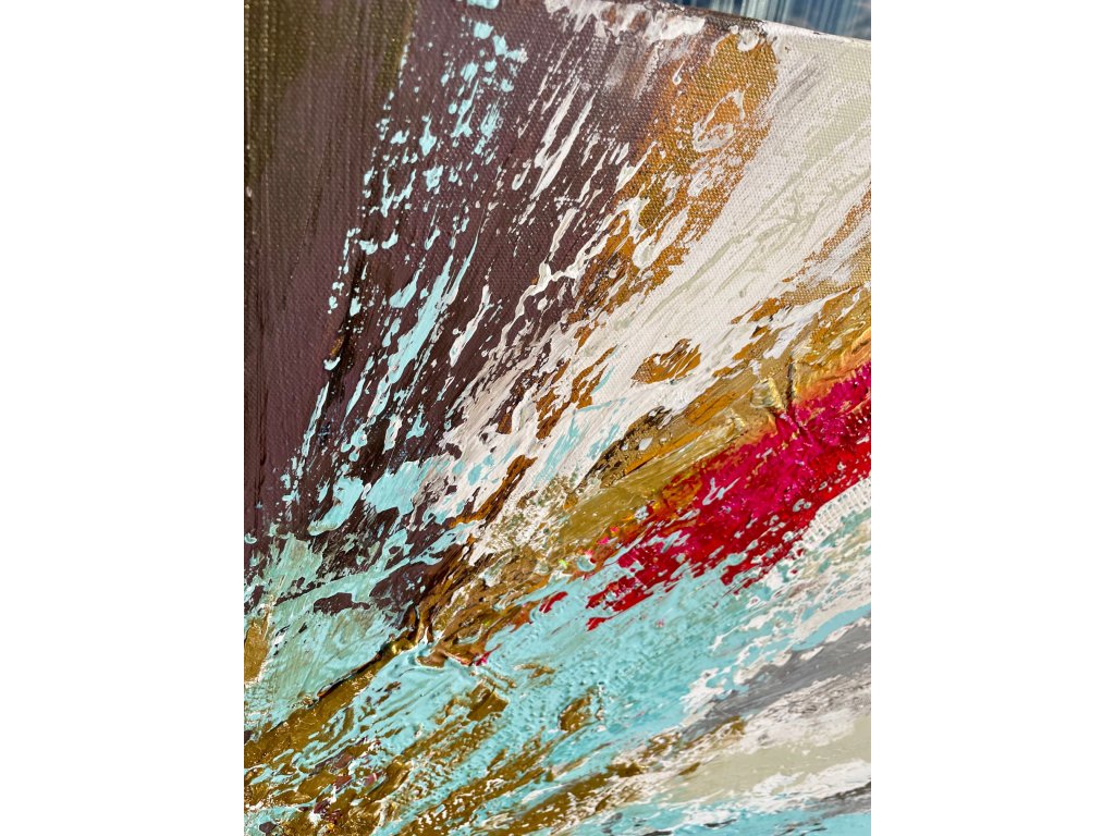 A fehér, kék, sárga, magenta, pink, barna és arany árnyalatok gazdag, vibráló színpalettája rétegzett, örvénylő kompozíciót alkot. A magenta és pink tónusok érzelmi mélységet adnak, miközben az arany részletek felerősítik a kozmikus fényhatást. Az alkotás a káosz és a harmónia kettősségét jeleníti meg, lenyűgöző fókuszpontként szolgálva modern és minimalista enteriőrökben. A festmény mérete 80x80 cm.