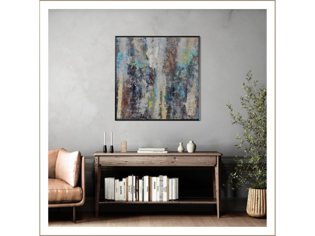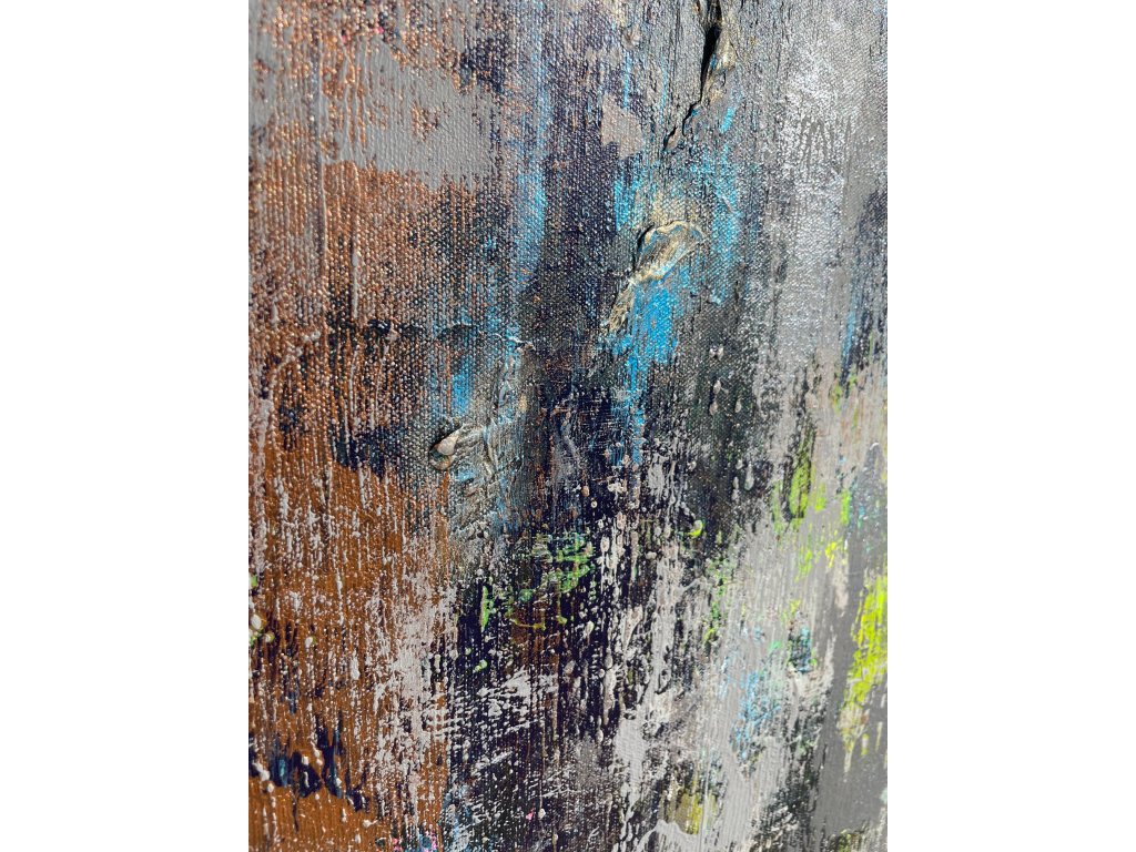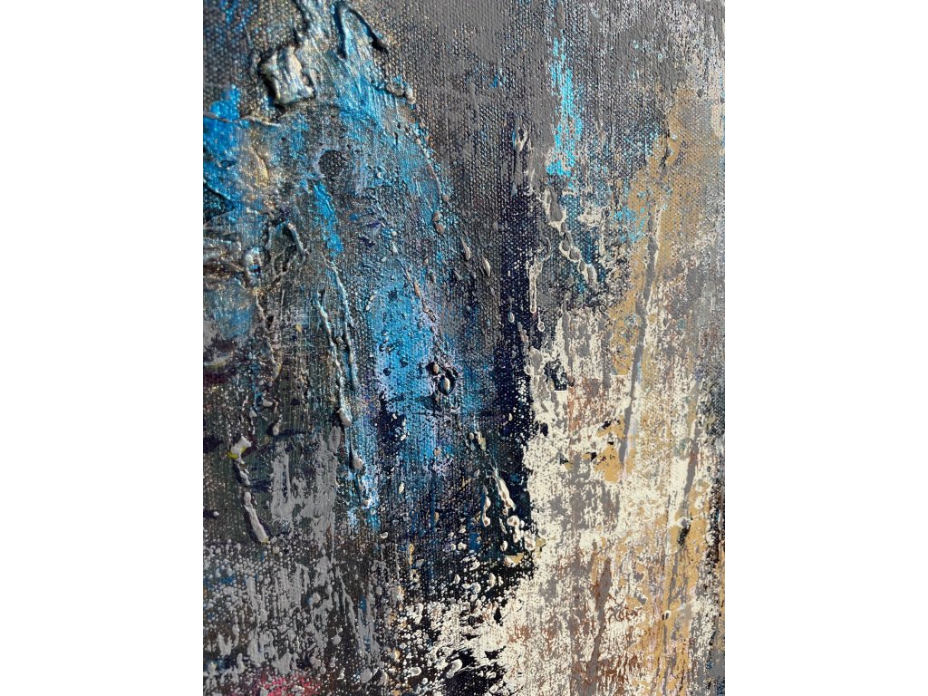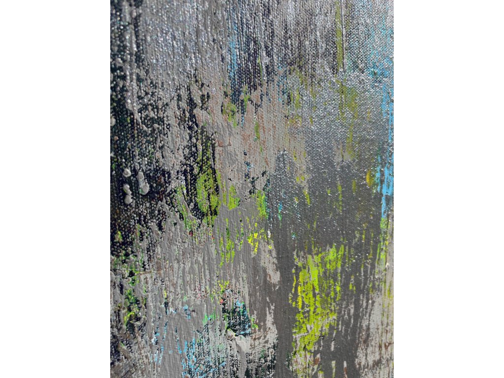 A lágyan rétegzett kék, bézs és szürke tónusok szelíd mozgást idéznek, amelyet a bronz melege és a lime zöld friss felvillanásai tesznek élővé. Az akril rétegek alatt gazdag textúrák és tapintható struktúrák keltenek látványos hatást, míg az éleken folytatódó mintázat harmonikusan illeszkedik a környezetbe. Ideális modern, letisztult enteriőrökbe, ahol a festmény csendes, mégis karakteres hangulatot ad.