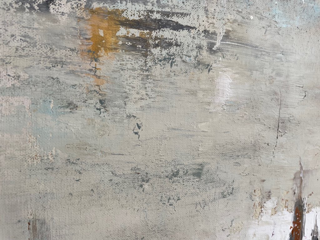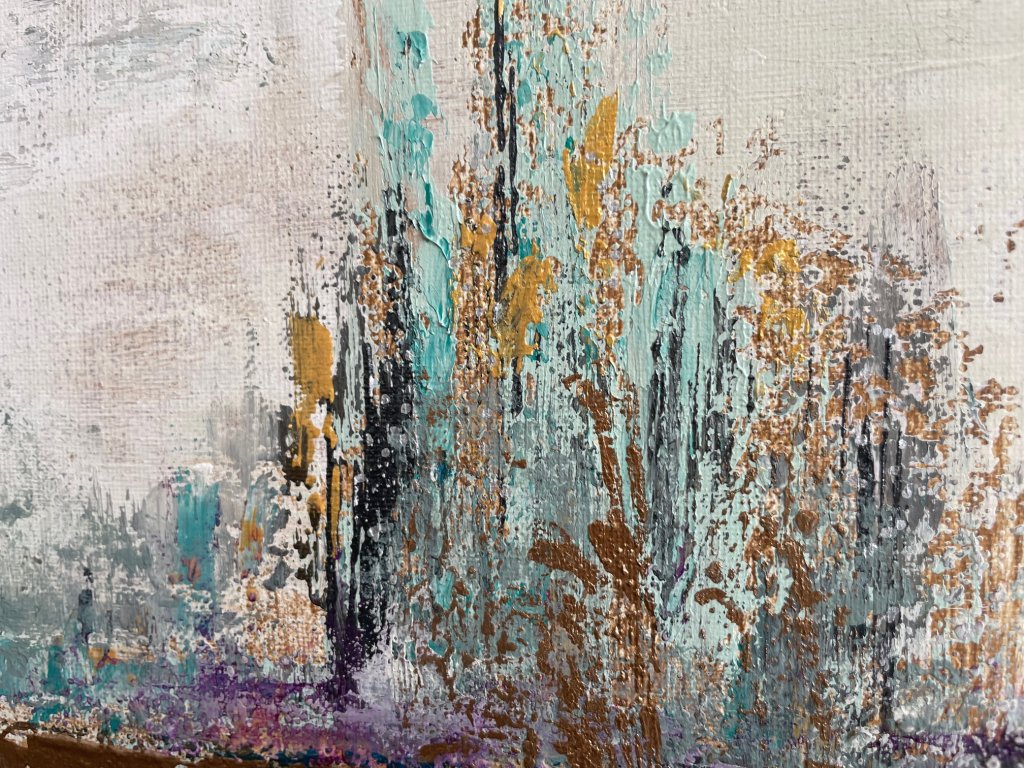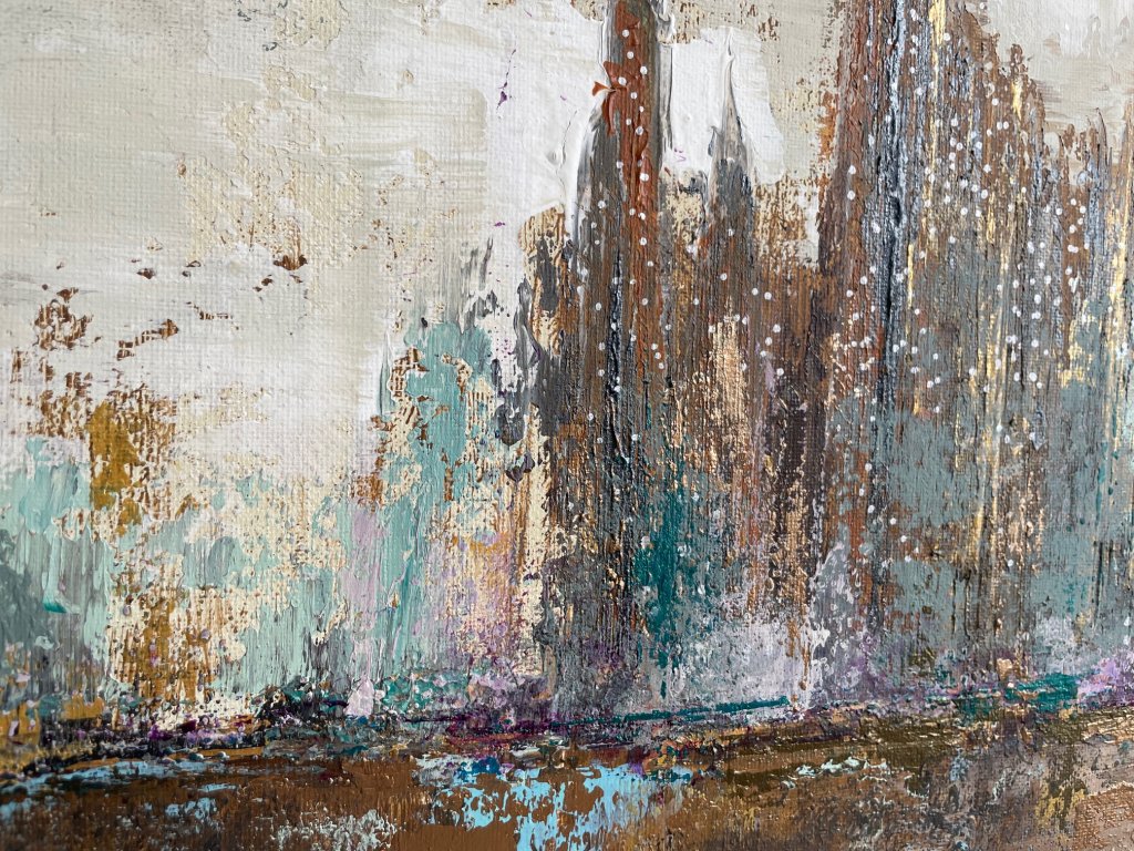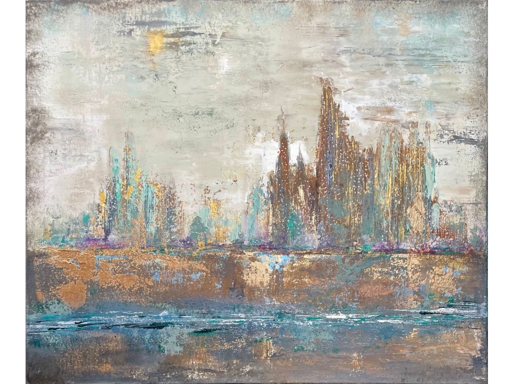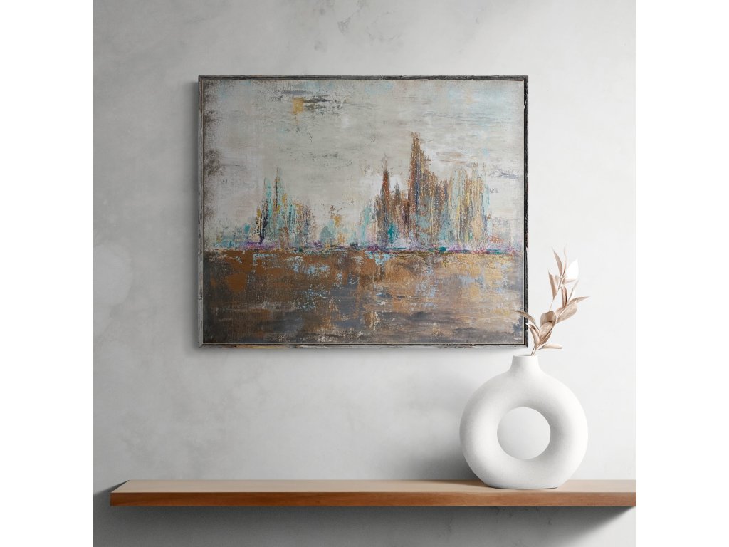 A barna, szürke és bronz árnyalatok földközeliséget és időtlen eleganciát sugallnak, míg a bézs lágy kontrasztot teremt. A pasztellzöld és lila részletek finom vibrálással törnek át, mintha az ősz halk suttogásai jelen lennének a városi forgatagban. A festmény a beton és természet találkozását, valamint a városi élet melankolikus szépségét idézi, ideális fókuszpont modern enteriőrökbe. Az alkotás mérete 50x60 cm.