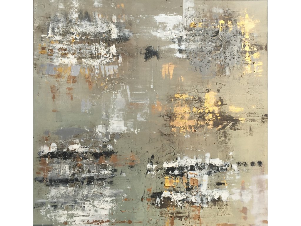 A ZÖLD JÁSPIS egy 100×100 cm-es, kézzel készített, sorszámozott absztrakt akrilfestmény természetes zöld, bézs és arany árnyalatokkal. Nyugalmat sugárzó, elegáns alkotás modern enteriőrökbe.